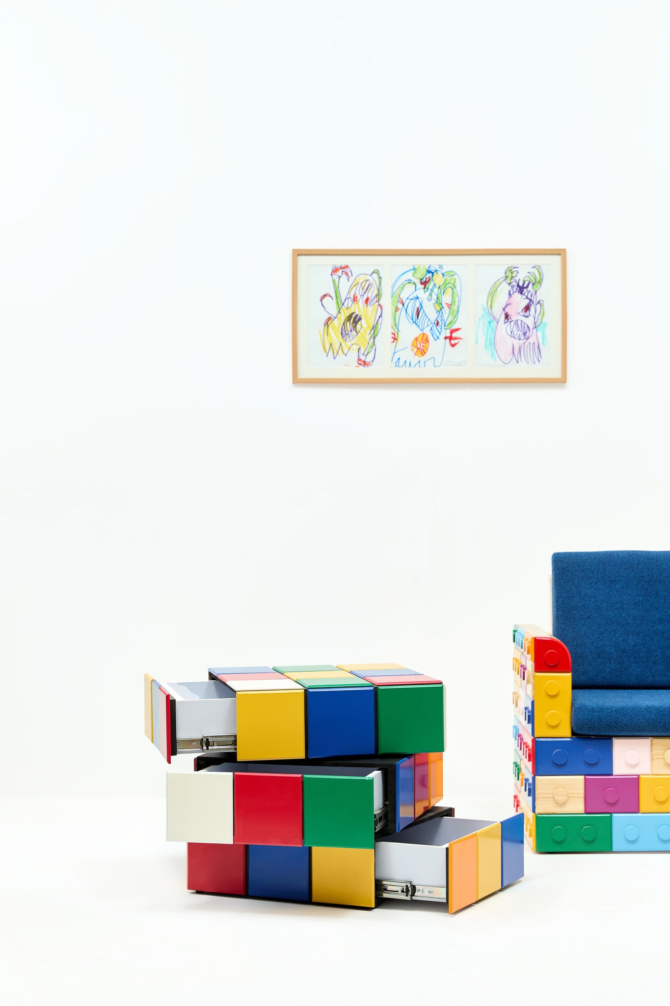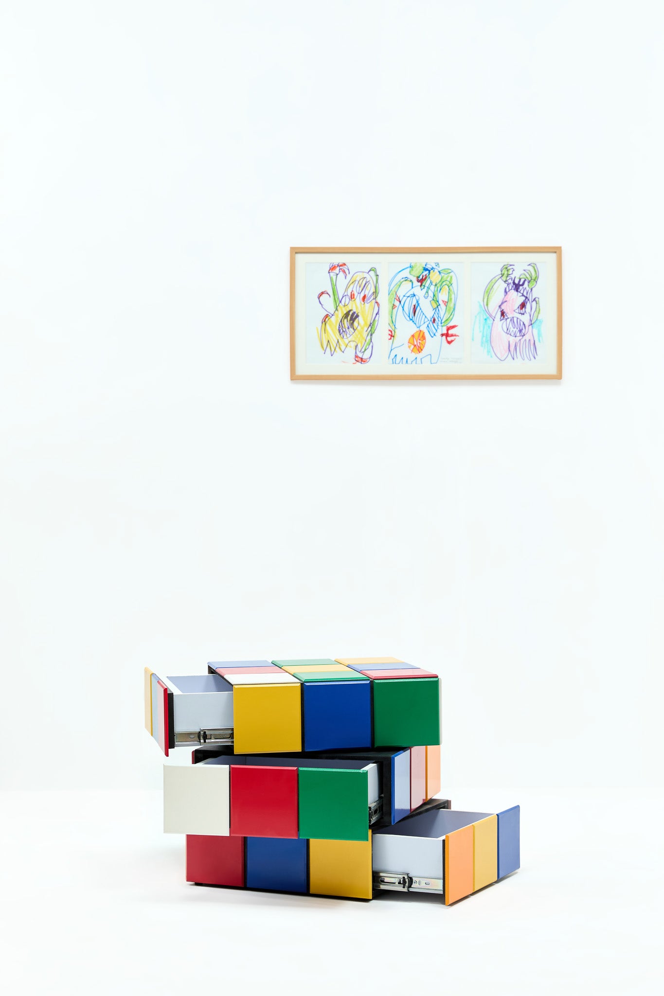 An interactive playful storage system for the child within us ! Inspired by the nostalgia of a Rubik cube toy, this side table has concealed drawers adding a perfect surprise element. Ideal of a kids room, creative spaces or a contemporary living area!
